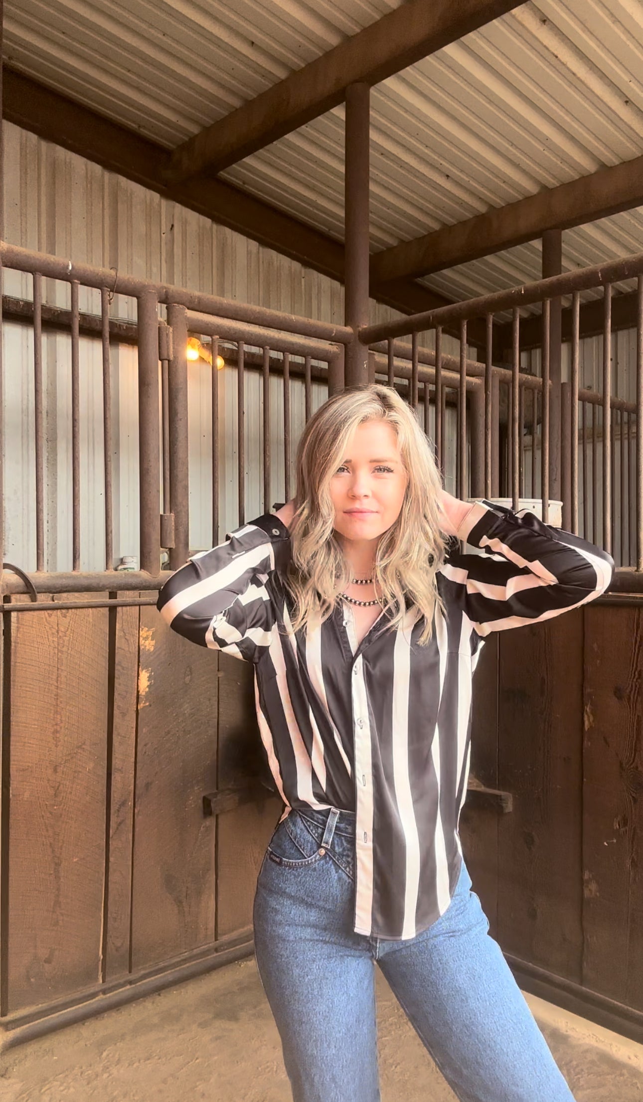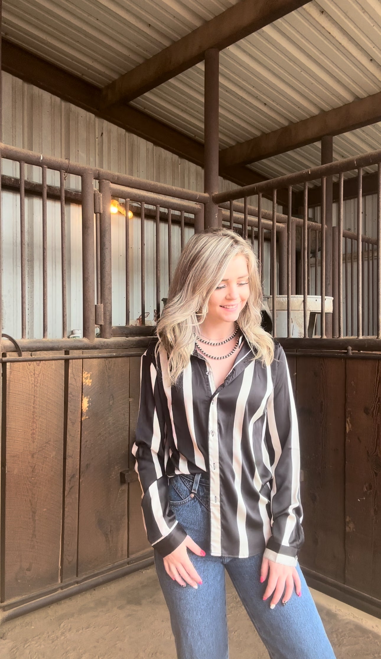 This button down black and off white stripped top is a silky material. It is a perfect top to dress up or down for a cute fit of the day.