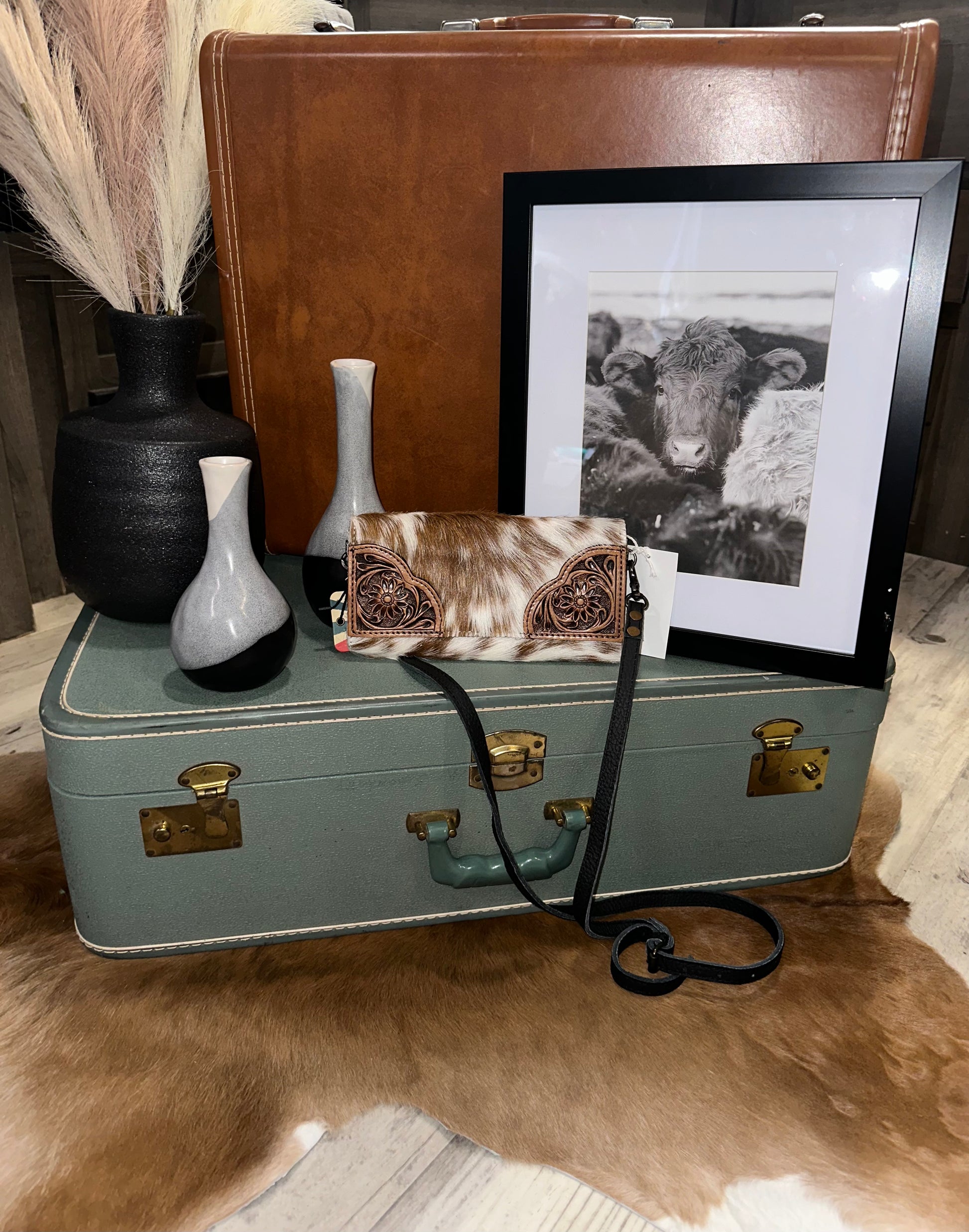 Longhorn Brown and White Cowhide With Tooled Leather Small Crossbody