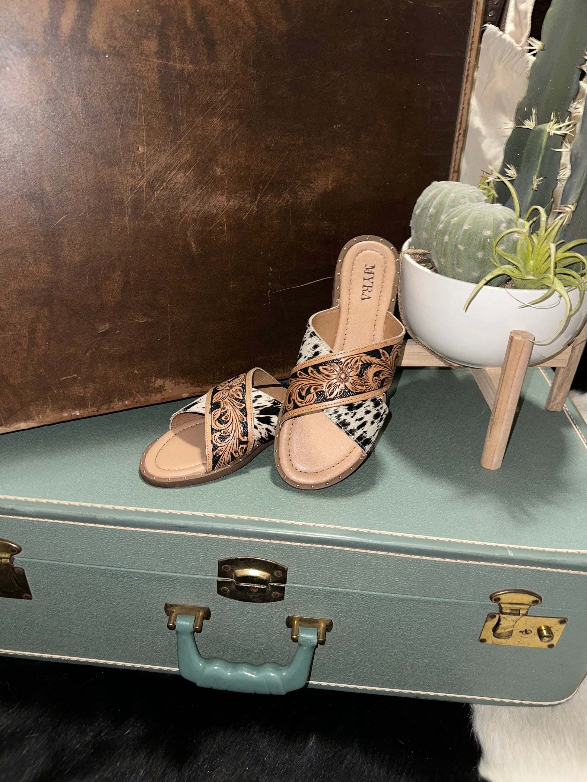 Cowprint and Tooled Leather Western Hand-Tooled Sandle